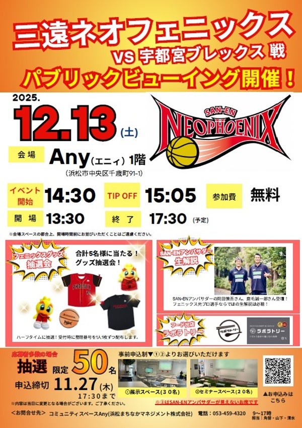 また、ハーフタイムには三遠ネオフェニックスのオフィシャルグッズが当たる抽選会も実施予定です。