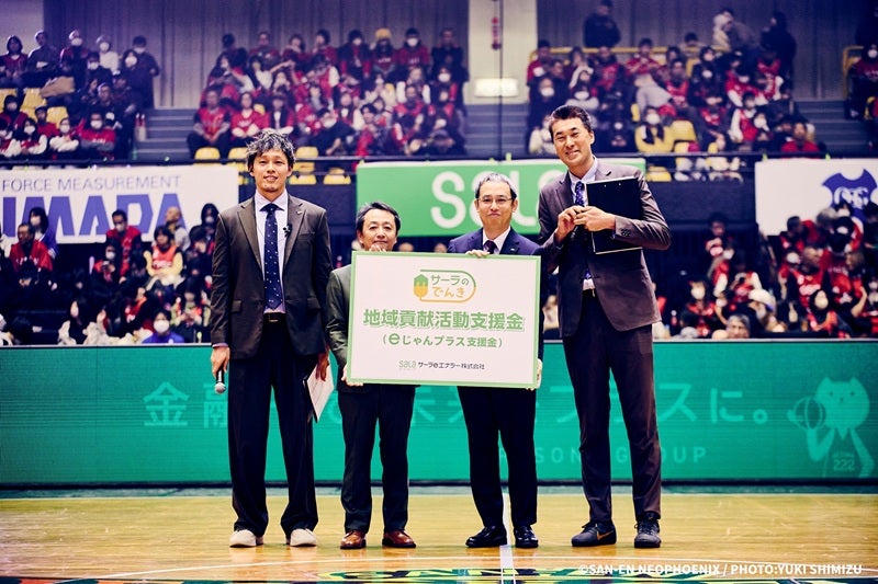 12月6日(土)ホーム島根戦において、2025-26シーズン 三遠ネオフェニックス オフィシャルパートナー サーラグループさまのプレゼンツゲームにて、サーラeエナジー株式会社 代表取締役社長 小林 隆一さま(写真右から二人目)にご出席賜り、地域貢献活動支援金の贈呈式を実施いたしました。