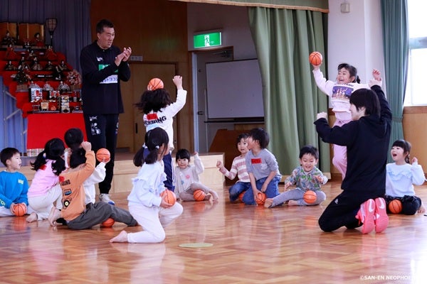 各園にて元選手でSAN-ENアンバサダーの鹿毛誠一郎、岡田慎吾とアカデミーコーチの小畑亜章子が交流会を実施し、終了後には子ども用のバスケットゴールやボールをプレゼントしました。