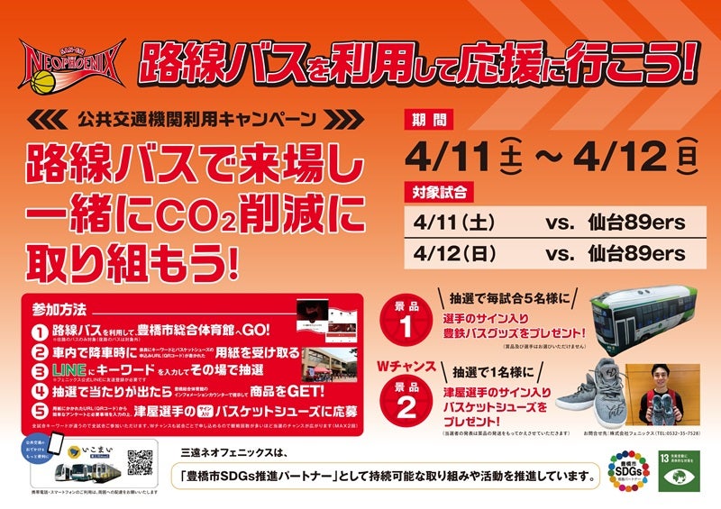このたび豊橋市SDGs推進パートナーである三遠ネオフェニックスでは、公共交通機関の利用を通じCO₂削減を推進する取り組みとして、4月11日(土)、12日(日)ホーム仙台戦にて「公共交通機関利用キャンペーン」を実施いたしますので、お知らせいたします。