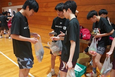 さらに、「食育」という観点から、成長期の子どもたちに競技力向上や怪我をしづらい身体づくりの大切さを伝えたいという想いのもと、豊橋市で農業を営む「松井農園」さまをはじめとする地元農家の皆さまより採れたての野菜と、運動後の栄養補給という視点から「夏目製菓」さまよりかりんとうを部員の皆さまへお渡しさせていただきました。