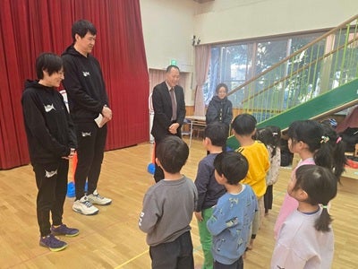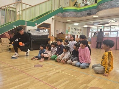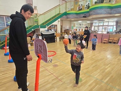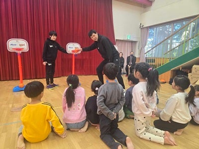 当日は、株式会社バスデイジャパン(※2)取締役社長 野本 和裕さまと清原もゝさま、三遠ネオフェニックス アカデミーコーチ 小畑 亜章子、フロントスタッフ 太田 敦也が訪問し、園児の皆さんと楽しくバスケットボール交流会を実施いたしました。
